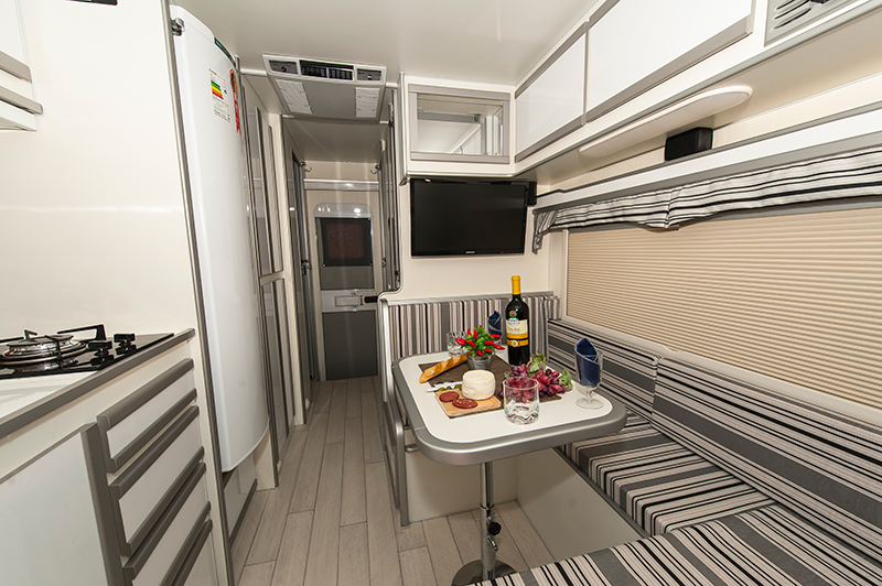 – Computador de bordo luminoso, com informações de: caixa de água limpa, caixa de água cinza (servida), tanque de detritos, amperagem das baterias da casa, amperagem das baterias do carro, voltagem de entrada da rede externa (110 ou 220V). Informa também se a bomba d’água está ligada, se o carregador de bateria está ligado e por onde a casa está sendo alimentada (inversor, rede externa ou gerador);