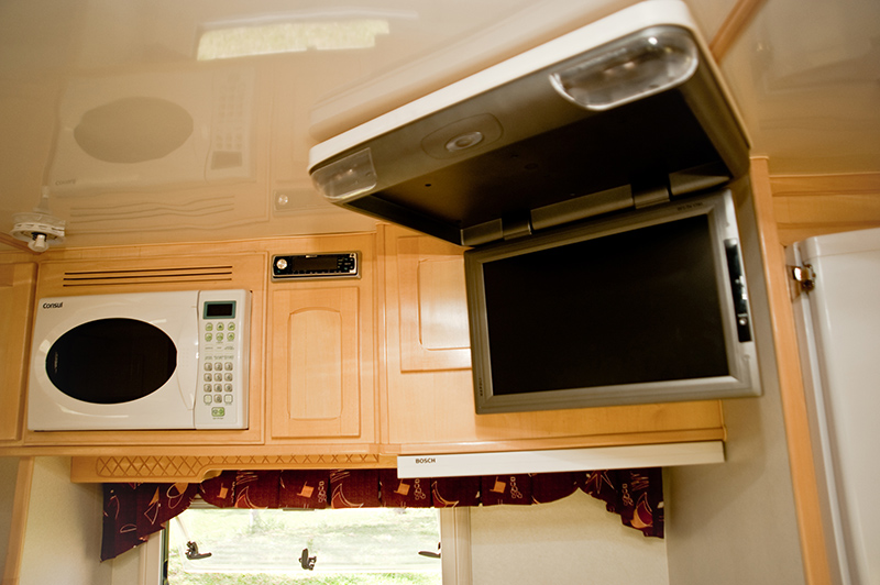 TV de LED de 32” instalada na sala do Camper, com blu-ray player.